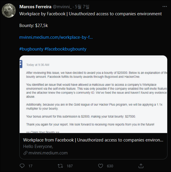 원본 버그바운티 Write-up을 확인하시려면, 아래 링크를 통해 확인하실 수 있습니다.